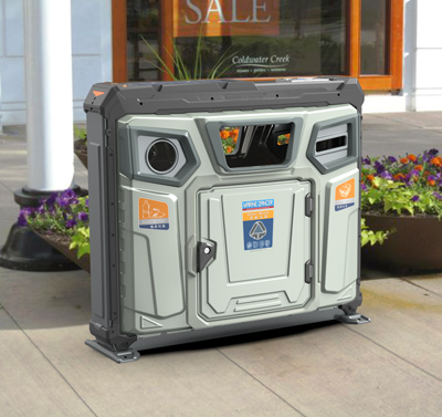 太陽能壓縮式垃圾箱為組合式多分類垃圾箱,模塊化箱體組合。瓶類垃圾、其他垃圾和紙類垃圾單獨(dú)分開投放。箱體內(nèi)置感應(yīng)壓縮模塊,當(dāng)桶內(nèi)垃圾達(dá)到一定的量,垃圾自動被壓縮,內(nèi)桶因此可以容納多倍的垃圾。此款垃圾箱采用人體感應(yīng)開門
